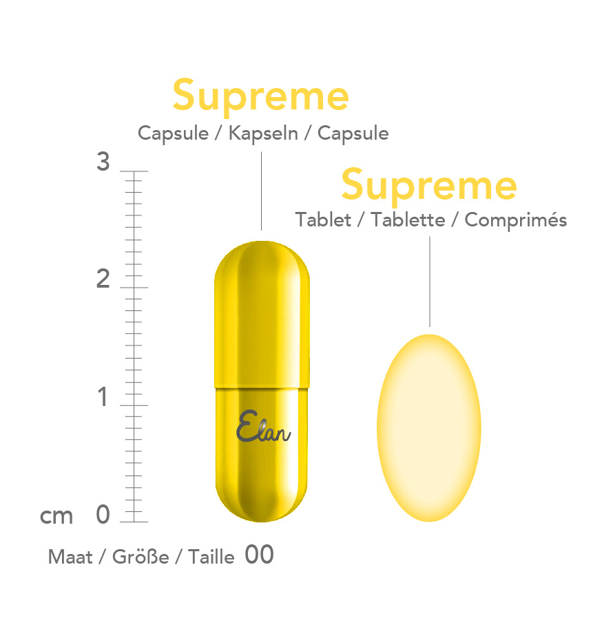 Supreme tablets are neutral in taste and odour. Thanks to their smaller size and smooth coating, Supreme tablets are even easier to swallow than Supreme capsules.